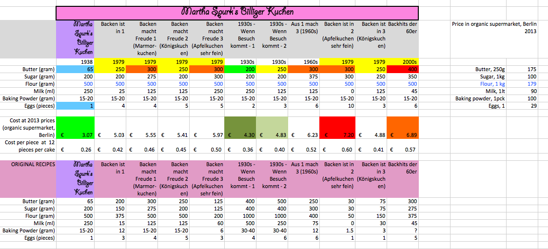 It turned out pretty quickly that baking powder remained the same and milk and sugar varied somewhat, but not hugely. However, the butter and egg content of the Billige Kuchen was much less than the other cakes – 4 to 5 times less. It was probably the bare minimum of butter and egg you can get away with to still make a sort of cake. That would explain the dryness…and the name: I calculated the cost of each cake according to the prices I pay now in my supermarket, and yes: eggs are the big one. And butter is not cheap either. Milk, flour and sugar are not hugely expensive (now, anyway). I guess this was not different in 1938.
