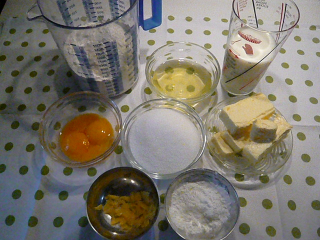 I have tried out the the first recipe from my granny’s recipe collection: the “Billiger Kuchen“. It’s not the first one in the notebook, but I was intrigued, because “Billiger Kuchen” means “Cheap Cake”, and I was wondering about that. I figured it might just be a way of saying “simple cake”. After all, these are just notes, and it is a pretty simple cake of the Rührkuchen variety, as in, the ingredients are more or less just stirred together (rühren means stirring) – flour, eggs, butter, sugar, milk, baking powder, and lemon zest for flavouring.