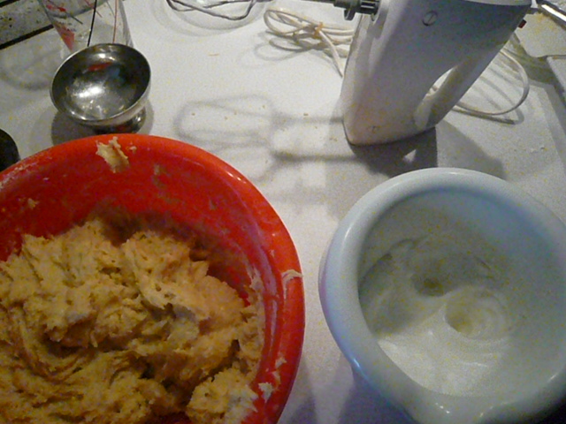 Beat egg whites until stiff. Carefully mix them into the dough with a wooden spoon (don’t use the mixing hooks, they are too rough on the egg fluff). The dough will become more smooth and silky again.